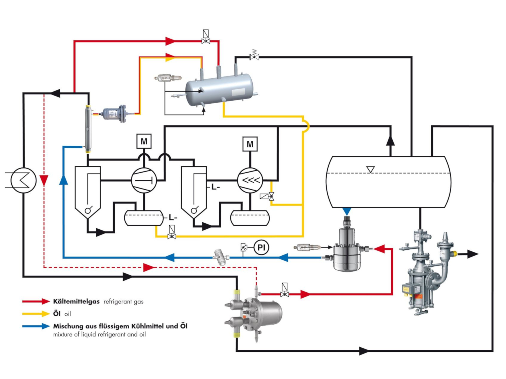 A refrigerant-oil-mixture is collected in the BDP and is dispensed from the low pressure side to the high pressure side of the compressor by means of hotgas. Any remaining liquid refrigerant is evaporating in a heat exchanger (WITT DWR) before being returned to the compressor.